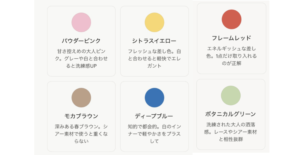 トレンドを知ったうえで「自分の色」で選べると、少ない服でも毎日のコーデが驚くほどスムーズになります。